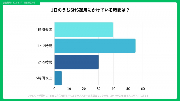 SNS運用にかける時間は「1日1~2時間程度」が最多で、特に夜のゴールデンタイム(20~23時)に投稿している人が目立ちました。