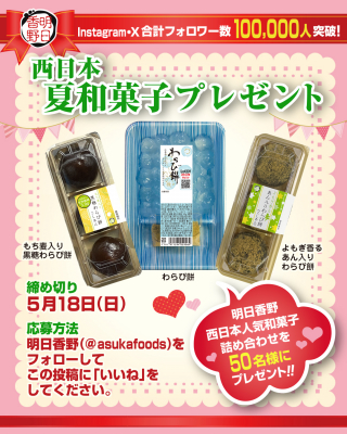 このたび、弊社が運営するSNS(明日香野【公式】X、明日香野【公式】Instagram)のフォロワー合計10万人突破を記念して、50名の方に季節の和菓子をプレゼントするキャンペーン「西日本 夏和菓子プレゼント」を開始しました。キャンペーンの開催期間は2025年5月7日から5月18日までとなります。