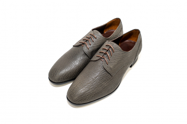 シャークレザーの力強さと深みを凝縮した漆黒の一足。無骨さと洗練が共存する、無駄を削ぎ落とした美の定番。