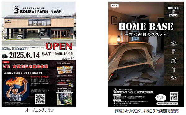 リニューアルオープン当日は、防災食の試食販売やアウトレット用品の無料配布、簡易トイレの実演による特価販売などを行うほか、WEBでの事前予約( https://coubic.com/BOUSAI_FARM/1065735 )にて「VR 火災からの脱出体験」を無料で体験いただけます。