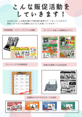 情報誌、DM、折込チラシ、広告など、集客活動はAirbikeが全面的にバックアップ。