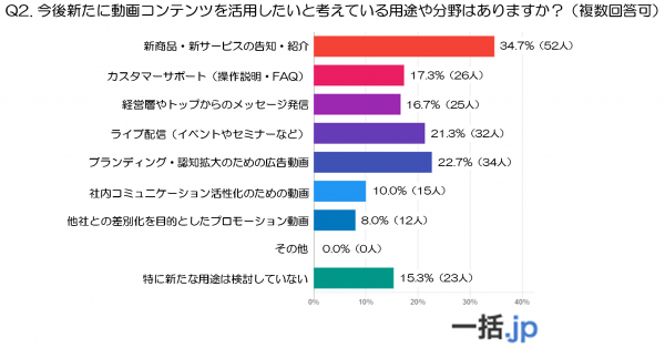 最も多かったのは「新商品・新サービスの告知・紹介」(34.7%)で、3人に1人以上が今後の商品・サービスのプロモーション強化を動画によって実現したいと考えていることが分かります。