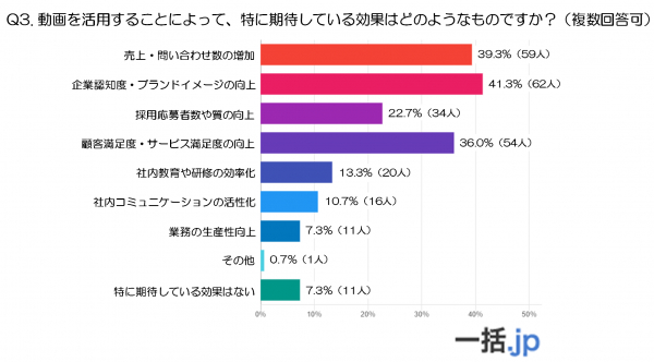 続いて「売上・問い合わせ数の増加」(39.3%)や「顧客満足度・サービス満足度の向上」(36.0%)も高い割合となっており、動画活用が直接的なビジネス成果や顧客体験の向上に結びつくことへの期待が大きいことが読み取れます。