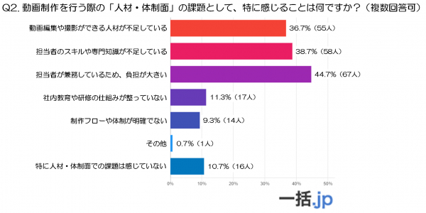 最も多かったのは「担当者が兼務しているため、負担が大きい」で、全体の44.7%(67人)にのぼっており、動画制作の専任担当が少なく、他業務と兼務するケースが多いことが分かります。