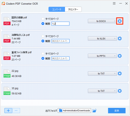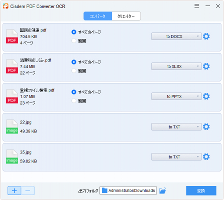 Cisdem PDF Converter OCRは、シンプルなインターフェースと強力な機能を備えたPDF変換プログラムです。元の書式とレイアウトを維持しながら、PDFをWord、Excel、PowerPointなどの一般的な形式に変換できます。また、その高度なOCR技術により、スキャンしたファイルと画像ファイルからテキストを抽出する精度が99%まで達します。50以上の言語を簡単に認識できます。さらに、PDF作成ツールとして、各ファイル形式からPDFを作成したり、異なるファイルを1つのPDFに結合したりできます。