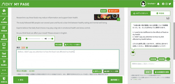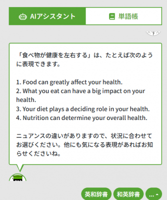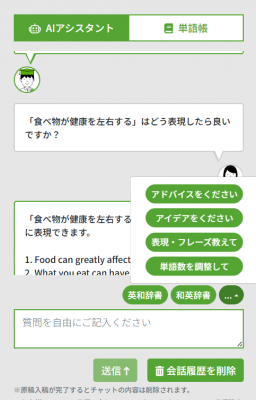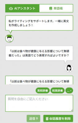 英作文を書く過程で生じた疑問について、分からないことをその場で質問したり、アドバイスやヒントを得たり、自由自在にAIを活用できる機能が「AIアシスタント」です。英作文上のいかなるお困りごとも、AIが瞬時に解決しますので、英作文をスムーズに書くことが可能になりました。