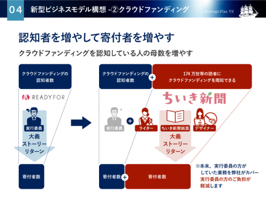 本モデルは、毎週174万世帯に地域情報紙『ちいき新聞』をポスティング配布してきた当社が、自社メディアに掲載する記事を活用してクラウドファンディングの認知拡大をすることで、地域の企業・団体の広告宣伝費を創出する新しい仕組みです。