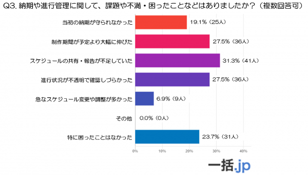 最も多かったのは「スケジュールの共有・報告が不足していた」(31.3%)という回答でした。制作過程で進捗や予定が十分に共有されず、発注者側が状況を把握しにくいケースが多かったことが分かります。