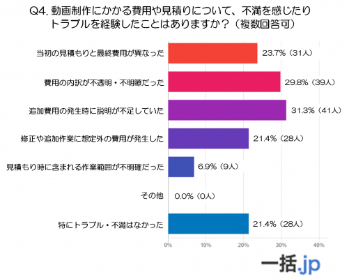 調査結果4:動画制作にかかる費用や見積りについて、不満を感じたりトラブルを経験したことはありますか?※複数回答可(注4)
