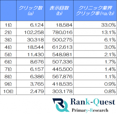 SEO支援で4,300社以上の実績を持つランクエスト(https://rank-quest.jp/column/column/how-to-seo/ )は、クリニックのクライアントサイトを対象に、2025年6月の検索順位ごとのクリック率(CTR)を計測しました。
