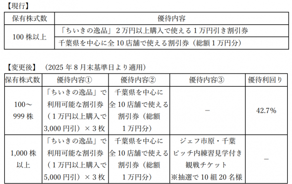 当社は、株式の投資魅力向上および当社事業へのご理解促進を目的として、2025年1月10日付けで「株主優待制度の大幅変更(拡充)のお知らせ」を公表いたしました。その後寄せられた株主の皆様からのご意見を踏まえ、より使いやすい制度となるよう一部内容を見直すとともに、中長期的な株式保有を促進し、厚くご支援くださる株主様への感謝の意を込めて、10単元(1,000株)以上保有の方を対象とした新たな優待制度を新設いたしました。これに伴い、当社がアシストスポンサーを務めるジェフユナイテッド市原・千葉のピッチ内練習見学付き試合観戦に抽選でご招待する優待内容を追加いたしました。