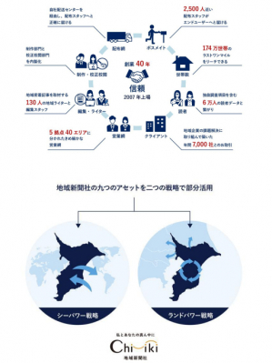 当社は、地域密着型の生活情報誌『ちいき新聞』の発行を軸に、情報発信および販売促進の総合支援事業を展開しており、年間約7,000社にサービスを提供しています。千葉県を中心に毎週発行している『ちいき新聞』は、専属の配布員により174万世帯へポスティングされ、創業以来40年以上にわたり配布を継続してきたことで、他に類を見ない9つのアセットを築いてきました。