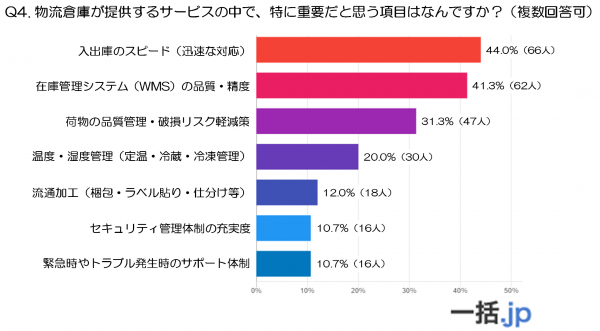 最も多かったのは「入出庫のスピード(迅速な対応)」で44.0%(66人)が選んでおり、現場でのオペレーション効率やリードタイム短縮が強く求められていることがわかります。