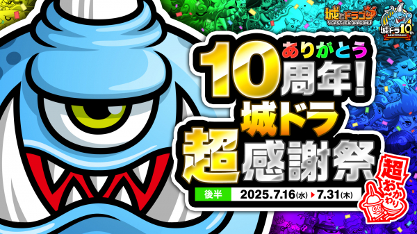 『城とドラゴン』で現在開催中の10.5周年キャンペーン「ありがとう10周年!城ドラ超感謝祭 超おかわり」の“後半”が、7月16日(水)0:00よりスタートします。特別なログインボーナスやミッションはもちろん、1日1回最大“10,100ルビー”が当たる!?「10周年ルビーアバたま」、最高“100,000ルビー”などが当たる「城ドラ宝くじ」が獲得可能なミッションも引き続き開催!さらに5日間で最大1,000ルビーを獲得できる「ルビー剣士登場ウィーク」や、厳選されたキャラがすくすく育つ「運営セレクト20キャラ超育成祭」も!10周年“超おかわり”の『城とドラゴン』で、ぜひお楽しみください。