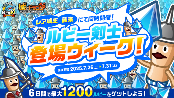 期間中、「ルビー剣士登場ウィーク!」という名前のレア城主イベントと襲来イベントに、倒すと2ルビーもらえる“ルビー剣士”が大量発生!すべてのバトルに参加すると、期間中に最大1,200ルビーを獲得可能!各イベントは1日1回まで発生するのでお見逃しなく!