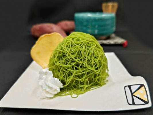 開業以来多くのお客様にお悦びいただいている当店のチーズケーキ『川越チーズケーキ(プレーン)』に、川越の特産品 “川越いも” と“河越抹茶”を合体させたオリジナルモンブランです。見た目も鮮やかな商品となっています。