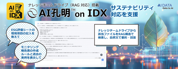 企業データとAIの利活用カンパニー、AIデータ株式会社(本社:東京都港区、代表取締役社長 佐々木隆仁、以下AIデータ社)は、企業や自治体が取り組む環境対応・ESG経営・サステナビリティ推進の実務を支援する、業界特化型生成AIソリューション「AI孔明 on IDX」において、RAG(検索拡張生成)対応ナレッジチームドライブ搭載版の提供を、環境・サステナビリティ業界向けに開始しました。
