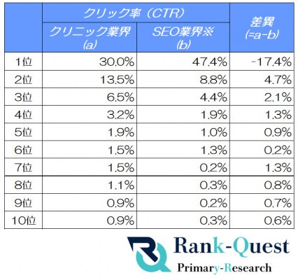 本調査では、検索結果上位10位にランクインしている12,373件のクリニック関連キーワードを対象に各順位でのCTR変動を詳細に分析。さらに、SEO業界向けのランクエストサイト(注)におけるクリック率データと比較することで、クリニック業界特有の検索行動の特徴を明らかにしました。