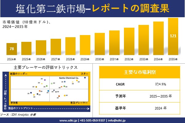 塩化第二鉄市場に関する当社の調査レポートによると、塩化第二鉄市場規模は 2035 年に約 121億米ドルに達すると予想されています。さらに、2024 年の 塩化第二鉄市場規模は約 78億米ドルとなっています。塩化第二鉄 に関する市場調査レポートでは、市場は 2025-2035 年の予測期間中に約 4.5% の CAGR で成長するとも述べられています。