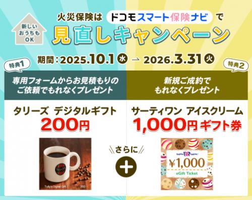 ・期間中、(株)ドコモ・インシュアランスを代理店として対象保険会社の火災保険を新規にご契約いただいた方にサーティワン アイスクリーム 1,000円ギフト券をもれなくプレゼントいたします。
