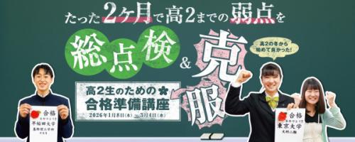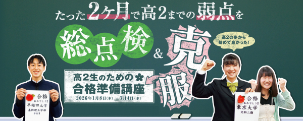 そこで四谷学院では、高3への進級直前の2か月間で、これまでの総復習と弱点の徹底点検を行い、いち早く受験体制を整えることができる「高校2年生のための合格準備講座」を開講します。