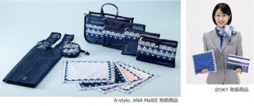 販売チャネルによって取扱商品が異なり、A-styleとANA Mall店ではタオルハンカチ4色、バッグインバッグ、エコバッグ、ポーチ3種、@SKYではタオルハンカチとポーチのセット商品を販売します。