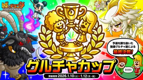 1月10日(土)6:00から「グルチャリーグ」と予選を勝ち抜いた強豪グルチャによる「グルチャカップ本戦」を開催!対戦相手のグループチャット「ライバルグルチャ」と“グルチャP”を競い合い、勝敗報酬としてルビー、ドラゴンメダル、きびだんごが獲得できます。またグルチャ内ランキング報酬として、グレードに応じた規定順位内のグルチャの全メンバーはドラゴンメダルを獲得。さらにグルチャカップ終了時、「貢献度」が「5000」を超えたメンバーはボーナス報酬を獲得できます。加えて既定のグルチャPに到達するとドラゴンメダルがもらえる「グルチャP到達ミッション」も併催。グルチャのメンバーと一緒に報酬を狙いましょう!