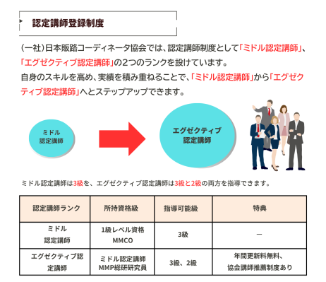 厚生労働省は、事業主等が雇用する労働者に対して、職務に関連した専門的な知識及び技能を習得させるための職業訓練等を計画に沿って実施した場合等に、訓練経費や訓練期間中の賃金の一部等を助成する「人材開発支援助成金制度」を設けています。「認定講師登録制度」はMMP総研の人材開発支援のための研修や、様々な業務スキル向上に役立つ資格研修を開催できる人材の養成を目的としています。認定講師の初級資格である「ミドル認定講師」は企業、専門学校、大学等を対象として各資格の3級レベルの資格取得研修を行うことができるため、認定講師資格を有する社内人材を確保することによって社内での資格研修をよりスムーズに計画・実施できます。