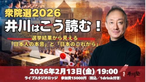 株式会社サイゾーは、2026年2月13日(金)、元大王製紙会長・井川意高氏によるトークライブ「井川塾・衆院選2026:井川はこう読む!選挙結果から見える『日本人の本音』と『日本のこれから』」を代々木・LIVE STUDIO LODGEにて開催いたします。