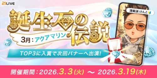 獲得数に応じて順位が決定し、ランキング上位に入賞したライバーには最大150,000ptの配信ポイント初期値アップやイベント限定バッジ、翌月開催の誕生石イベント用バナー出演権などをプレゼント!