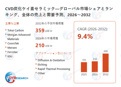 世界のCVD炭化ケイ素セラミック市場は、2025年の193百万米ドルから2026年には210百万米ドルへ拡大し、2026~2032年の年平均成長率(CAGR) 9.4%で推移することで、2032年には359百万米ドル規模に達すると予測されています。