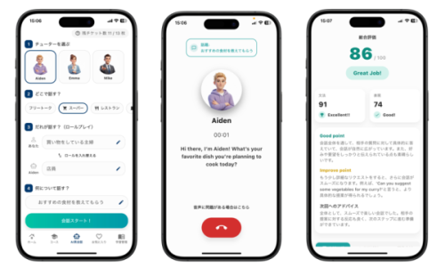 ▲ AI英会話「SUPITORA(スピトラ)」会話設定画面・会話画面・フィードバック画面