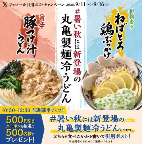 株式会社丸亀製麺は、2025年9月11日(木)10時30分から9月17日(水)10時29分まで、X(旧Twitter)を活用した「#暑い秋には新登場の丸亀製麺冷うどん フォロー&引用ポストキャンペーン」を実施しています。