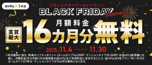 ニフティは、同社が提供する光回線サービス「@nifty光 3年プラン(N)」の新規申込者を対象とした「BLACK FRIDAYキャンペーン」を2025年11月4日(火)から実施することを発表しました。