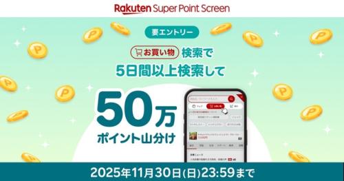 楽天グループは、同社が運営するポイ活アプリ「Super Point Screen」において、楽天ポイント50万ポイントを山分けするキャンペーンを2025年11月に実施します。