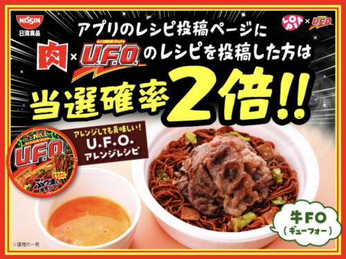 さらに、アプリ内でU.F.O.のアレンジレシピを投稿すると当選確率2倍!U.F.O.を使った「牛FO(ギューフォー)」など、アレンジ例も紹介されており、楽しみながら応募できる内容になっています。