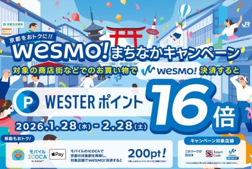 西日本旅客鉄道、KICS、ジェーシービーは、スマホ決済アプリ「Wesmo!」による「京都をおトクに!! Wesmo!まちなかキャンペーン」を2026年1月28日(水)~2月28日(土)に京都で実施します。