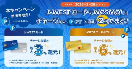 同期間、J-WESTカードからWesmo!へチャージした利用者には、通常は最大1.5%(ゴールドカードは最大3.0%)の還元率を、最大3.0%(ゴールドカードは最大6.0%)に引き上げて後日付与します。