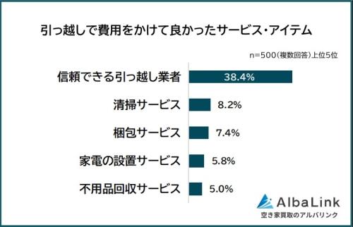 一方で、費用をかけて良かったサービス・アイテムは「信頼できる引っ越し業者」38.4%がトップ。「清掃サービス」8.2%、「梱包サービス」7.4%、「家電の設置サービス」5.8%、「不用品回収サービス」5.0%が続き、安心感や手間の削減に対する評価が高い結果となりました。