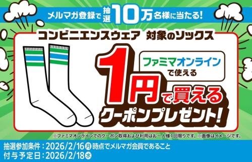 2026年2月3日(火)10時00分~2026年2月16日(月)23時59分の期間、メルマガ登録者(既存購読者を含む)から抽選で100,000名に、「コンビニエンスウェア」の対象ソックスが1円で購入できるクーポンを配布します。