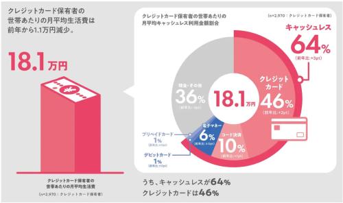 家計における支払いでは、クレジットカード保有者の世帯あたりの月平均生活費18.1万円のうち、64%がキャッシュレスで支払われ、前年から3pt上昇しました。