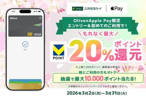 三井住友カードは、2026年3月2日(月)から2026年3月31日(火)まで、Olive限定でApple Payの利用がお得になるキャンペーン「【Olive限定】Apple Pay初利用でもれなく最大20%還元!既にご利用の方も最大10,000ポイント当たる!」を実施します。