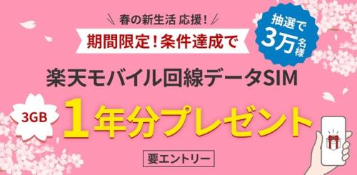 新規で口座振替の設定・初回実行、または新規の給与・賞与受取を行い所定条件を満たすと、抽選で3万名に楽天モバイル回線データSIMが進呈されます。