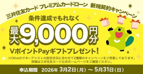 三井住友カードは、カードローン機能(三井住友カード プレミアムカードローン)を新規契約した利用者を対象に、VポイントPayギフトを進呈するキャンペーンを実施します。