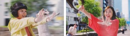 次の瞬間、2人はその機能に「えーー!」と驚き、勢いよく後方に飛んでいきます。街にいたアヤの前で減速し、「新しいiPhoneは…」と秘密を打ち明けると、アヤも「えーー!!」と驚いて一緒に飛んでいきます。さらに途中で出会ったお母さんとお兄ちゃんに、アヤが「ソフトバンクは毎年おトクに買い替えられるんですって」と伝えると、2人も「おトクーー!!!」と声を上げて加わります。