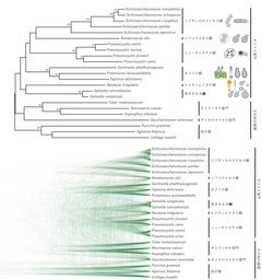 ロングリードシーケンサーを使用してゲノムを解読した結果、それぞれの染色体の全長が繋がったゲノム情報が構築できました。このゲノム情報を基に予測した各相同遺伝子の系統関係から生物種間の系統関係を推定すると、遺伝子配列を連結して推定した結果と同様にサイトエラ属はヒメカンムリタケ綱 (Neolectomycetes) との類縁関係が示唆されたものの信頼性は低く、元となるそれぞれの遺伝子の推定系統関係でも既存のどの分類群と明確に類縁とは言えないものでした(図)。さらに、サイトエラ属は遺伝子のアミノ酸配列が亜門内の多くのグループにとってもっとも類似していることがわかり、亜門内でも祖先的な配列を維持していることが推定されました。このことから、サイトエラ属は既知のグループとは異なる独特の系統であると言え、新綱4)「サイトエラ綱(Saitoellomycetes)」として記載しました。サイトエラ(Saitoella)は微生物学者・斎藤賢道博士5)に因んで献名された属名であり、綱という大きな分類群が日本人の名前を冠するのは珍しいことといえます 。