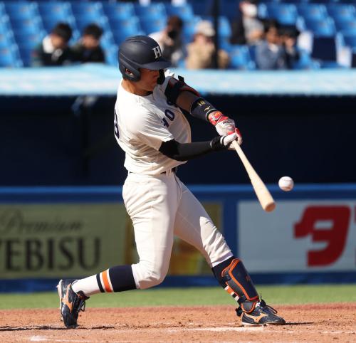 法大の山田頼旺外野手(1年=中京大中京)が、大学公式戦で初本塁打を放った。3回2死走者なしから、やや外寄りの直球をとらえライナーで左翼席へ運んだ。「風は関係なかったです。手応えは十分でした」と先制アーチに胸を張った。「慶応にはフレッシュでずっと負けていた。4度目の正直で、絶対勝ちにいこうとチームが1つになっていた。少しでも貢献したいという気持ちで打席に立ちました」と振り返った。