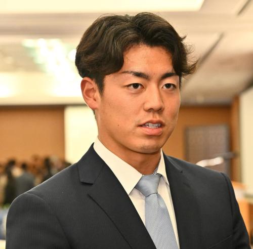 NPB新人研修会に出席。大学日本代表でプレーをともにしたメンバーとも再会し、「これからは本当に誰にも負けないと思ってやりたい。(阪神1位の)立石を含め、誰にも負けないように」と表情を引き締めた。