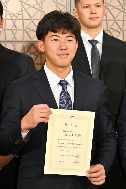 プロ野球界に名を刻み、殿堂入りする! 阪神ドラフト1位の立石正広内野手(22=創価大)が9日、都内のホテルで行われたNPB新人選手研修会に参加。野球殿堂博物館を見学した際に長嶋茂雄さんらレジェンドの展示品に感銘を受け、将来殿堂入りする選手になる大目標が定まった。講師を務めた通算104勝の球団OB、能見篤史氏(46)からも近い将来の中軸を期待され、決意は新たまった。