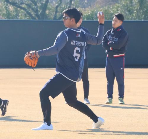 ドラフト1位松下歩叶内野手(22=法大)が守備率10割を目指す。宮本慎也氏(日刊スポーツ評論家)モデルに似たミズノ社製グラブを使用。「形は違いますけど色はずっと見ていてかっこよかったので意識しているかも。バッティングはミスがあるものだけど守備率は100%を目指す」。